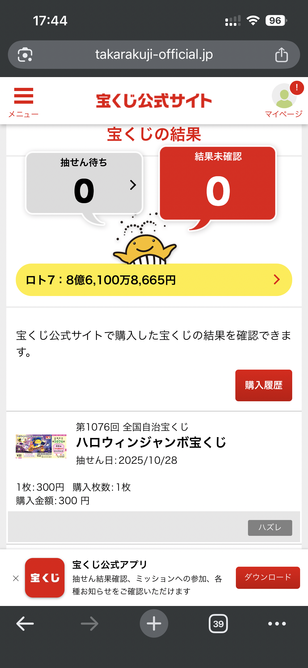 ハロウィンジャンボ宝くじの抽選結果が出ました。