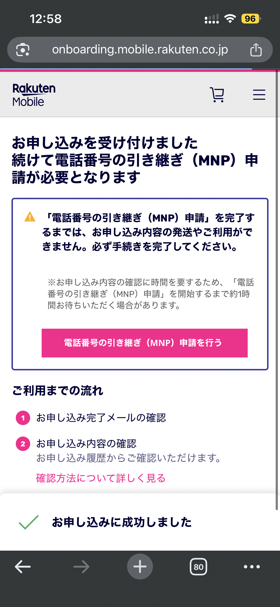 mnpをしないと1円にはならないようなので、サブ回線のpovoで楽天モバイルに転入するために予約番号も取って案内を待ちます。