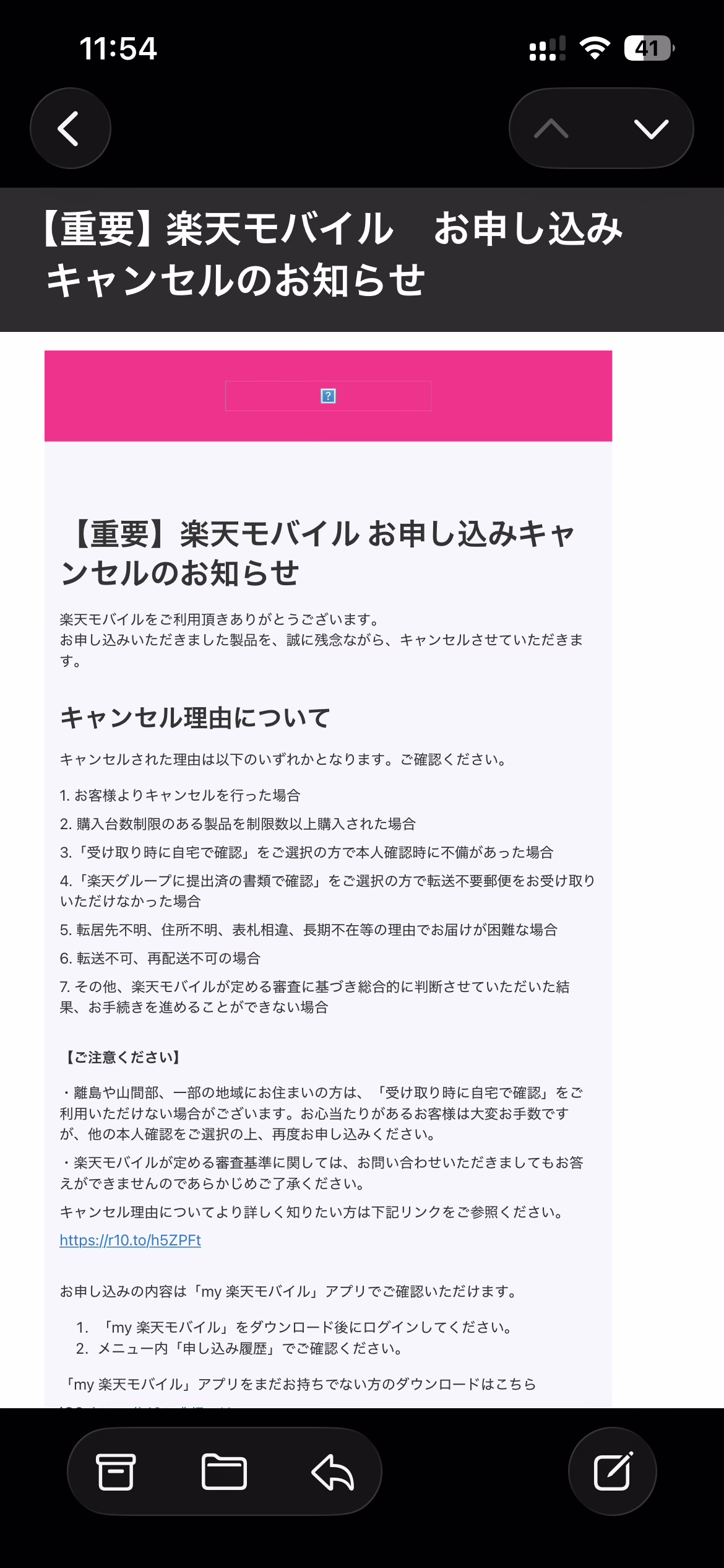 楽天モバイル「お申し込みキャンセルのお知らせ」