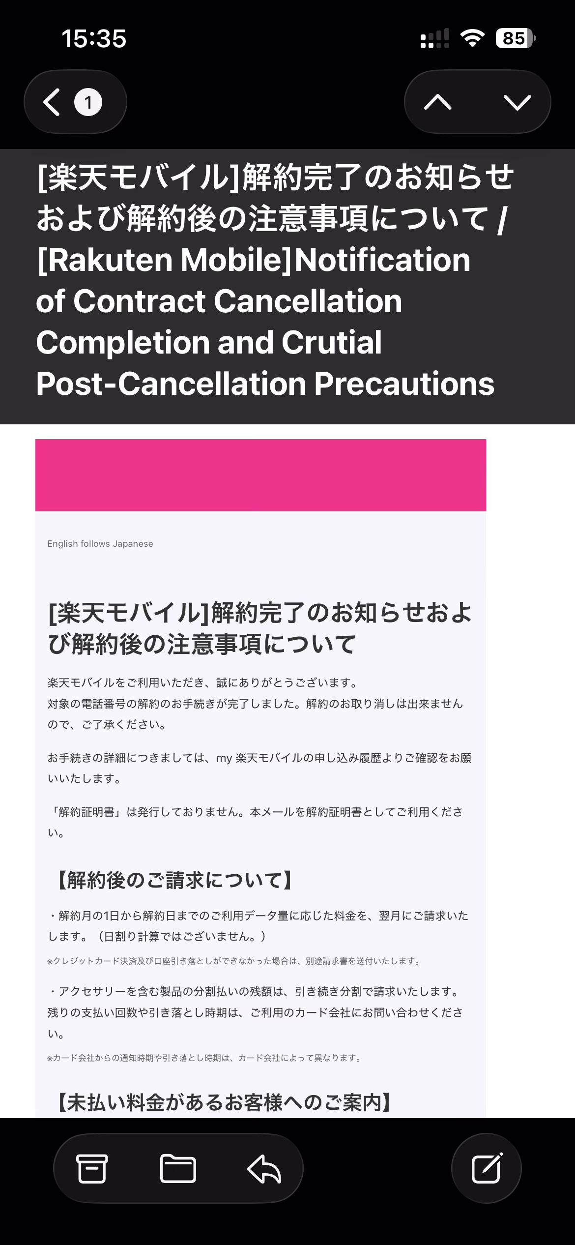 これまで使っていた楽天モバイルから解約通知が来ました。