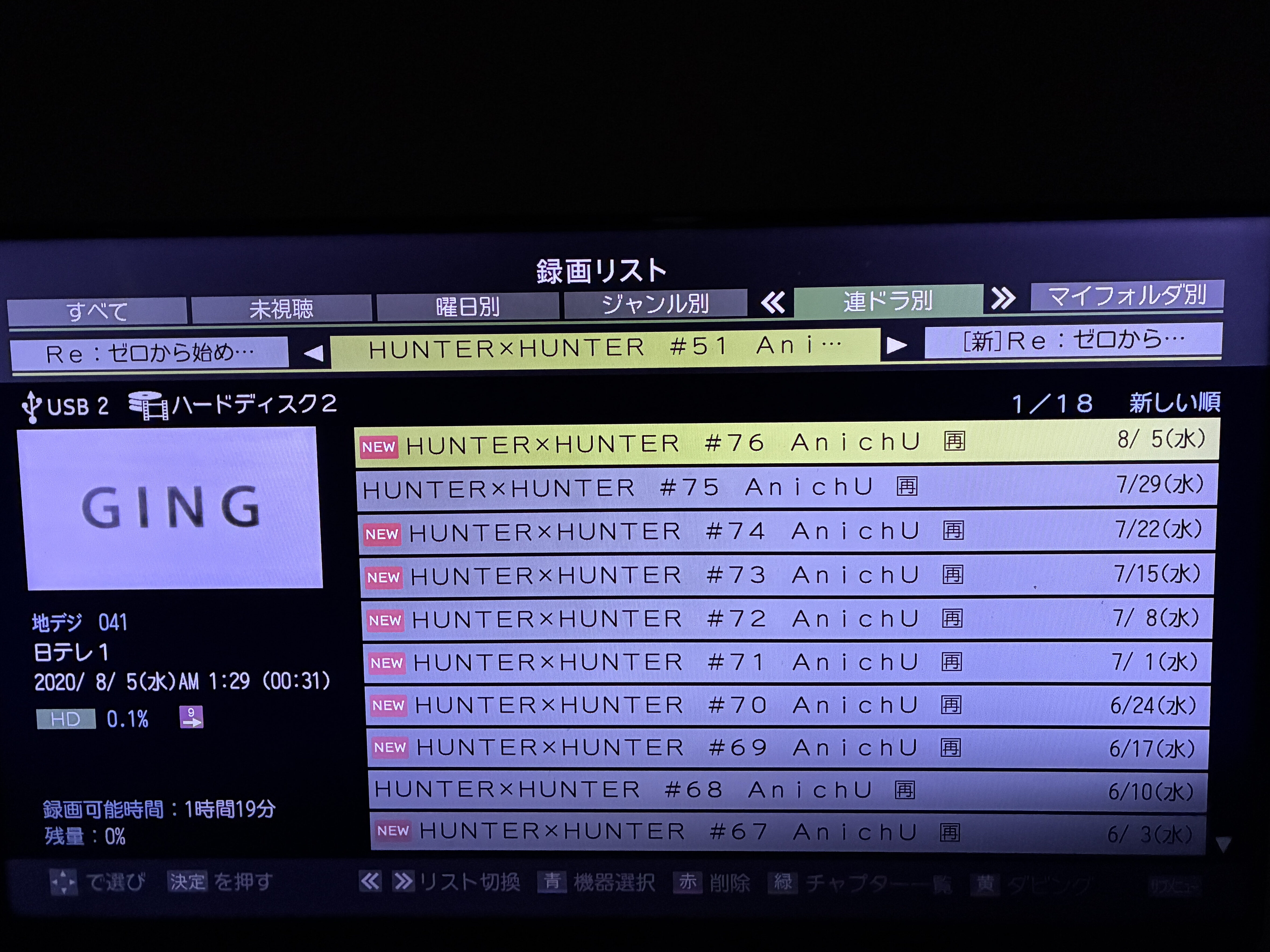 1台はドラマ、映画、バラエティ、ドキュメンタリーなど実写、もう1台がアニメという風に分けていたんですが、実写の方のHDDが容量を食い過ぎるのでドキュメンタリーもアニメの方に移動させて運用するようになりました。