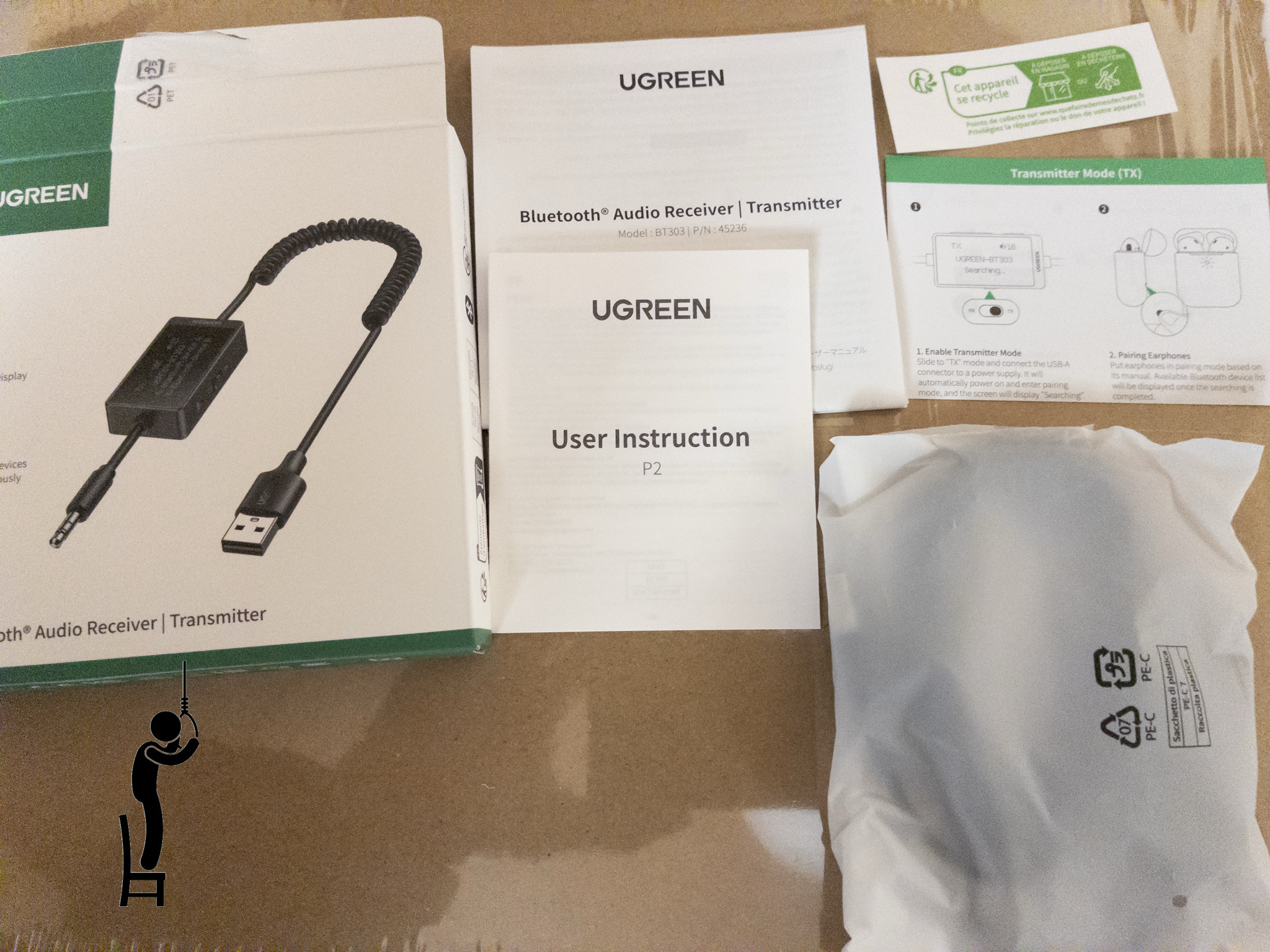 Bluetooth機能が付いていないんですが、3.5mmジャックとUSB端子に接続するとBluetoothが使えるようになる発信機を買いました。